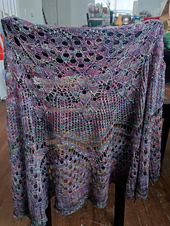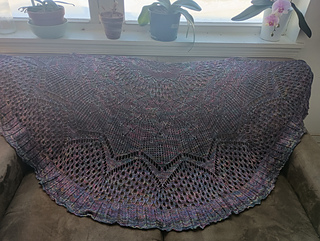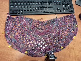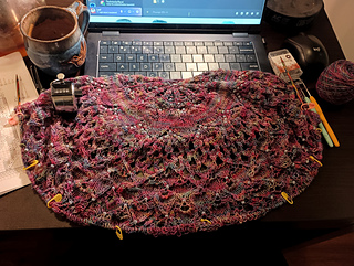I have now completed two repeats of the optional extension (rows 139-146) and will now endeavor to do 10 repeats of rows 149/150 and see where that takes me on the yarn I have left and the look of the shawl before binding off. I think there will be maybe at best two more days of knitting for this project.