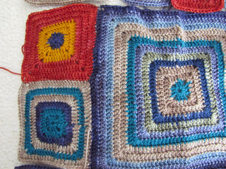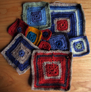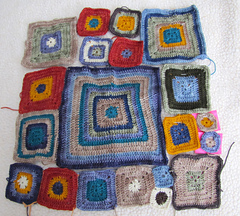 Anyone who has looked at this pattern knows it is a big project, with over 100 granny squares, and a more than 4 times as many changes of color. It’s a project that will keep you interested and which you can adapt to your personal taste. I’ve chosen to do my own color scheme, which will radically alter the look of the blanket. That also means the project will take a good deal of extra time as I experiment with color.