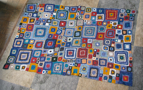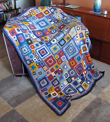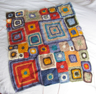 As I continue working on the blanket, the color arrangement is coming into focus. I have completely dispensed with designer Kathy Merrick’s palette and her detailed chart indicating how to use those colors for each square. As a result, the project has taken on a life of its own.