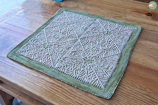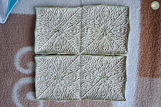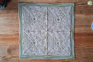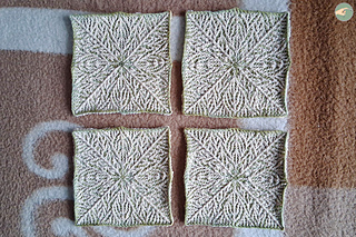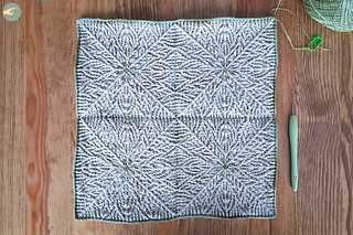→ Initially, I wanted to crochet version 1, which is a single large square. However, on row 36, I realized that it would have been too small, even if I had continued to row 49. This was because I was using very fine yarn! So I unraveled the rows back to row 27 and reworked row 28 with ch1 instead of ch2. Unblocked, this square measured about 14,2cm (5.6”) on each side, and I thought that assembling four of these squares would be the perfect size after blocking and edging.