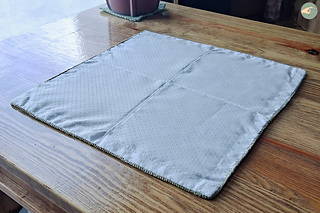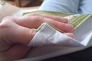 → J’ai alors acheté, chez Tissus des Ursules, de la toile antidérapante blanche avec des petites boules de PVC en dessous. Après y avoir fait un ourlet à la machine, je l’ai cousu à la main sur l’envers de l’ouvrage au crochet avec du fil en polyester blanc.
