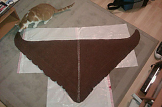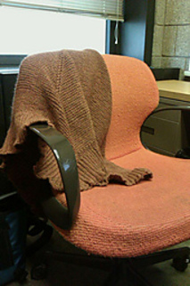 08/27/10 — Finally finished! I started binding off while on the D train going to work this morning. Then I finished binding off during my lunch break because I simply could not hold out any longer: it was freezing in my office! (It’s also really cold on the express bus to/from Staten Island. They blast the A/C on max the whole ride!) All that’s left is a good soaking and a mediocre blocking. I just want it to soften up and grow a little :)
