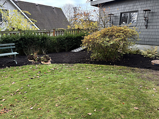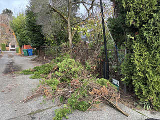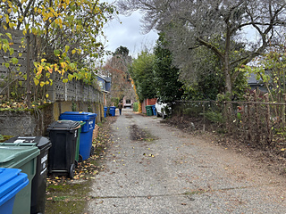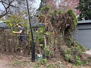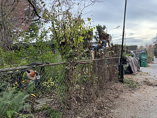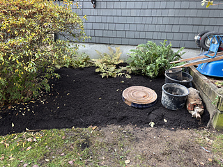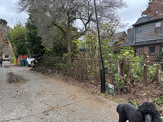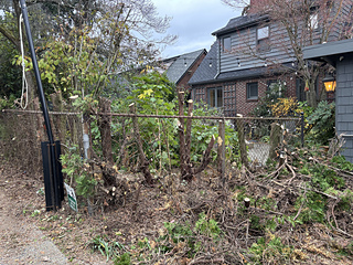 10/17 First project is to fix drainage to keep rain water from going into the garage. I had made a wonky fix and relocated one downspout through a hedge out to the alley. In the new garden plan the hedge will be removed so the downspout has to go. It is being rerouted around garage to tie into line in front of house. A new drain will be install along the front of garage.