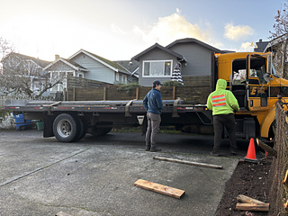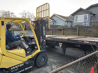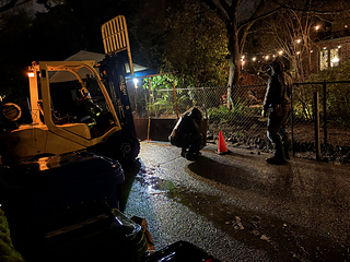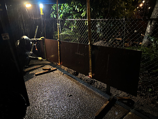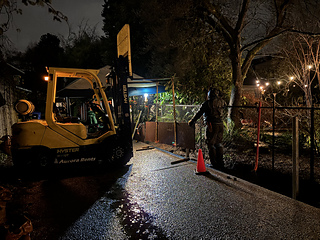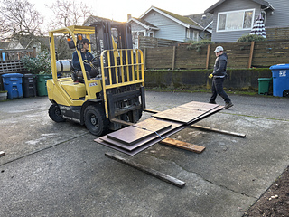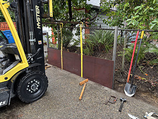 A forklift and the steel for the fence post and retaining wall was delivered 12/15. John used a hand held pile driver to drive the fence posts into the ground, some as deep as 5’. He used the fork lift to moved the steel panels of the retaining wall into place and then welded them together and to fence posts.