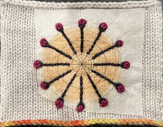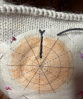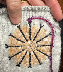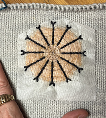 Embroidery: I’m using adhesive backed water soluble stabilizer. It’s new for me and it’s great stuff! Sulky Stick ‘n Stitch. I printed some concentric circles and spokes onto the stabilizer, cut out the part I wanted and stuck it in place on my swatch. I was afraid it might move, so I belt-and-suspendered it with a few pins. For the sweater itself I basted it with high contrast sewing thread, because I kept sticking my fingers accidentally with the pins on the swatch. I’m not sure the basting was necessary, but I didn’t want to find out it would have been. Basting took 2 minutes. The stabilizer dissolved away in under a minute in warm water. Worked like a charm! The stabilizer looks more transparent in the photos than it does to my eye. Use your phone camera to judge positioning!