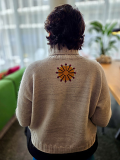 This design is intentionally in pieces, rather than top-down and in the round, to facilitate the intarsia and embroidery. Relax and take the time to do the embroidery before assembling the front and back!