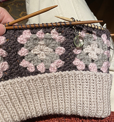Started by using US 7 DPNs and picked up 84 stitches (14 per crochet square). Knitted 2 rounds and then k2tog at the end of each six sets, every other row. Got down to five stitches left in each set and then went with two back-to-back decrease rounds. Ended with one k2tog round.