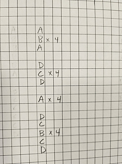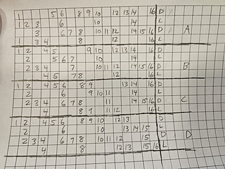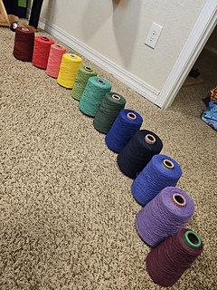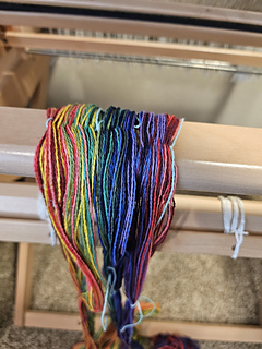 2x around on warp board then drop a color and add a color. Do 3 rotations and then tie off so 4 groups total.
