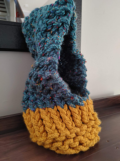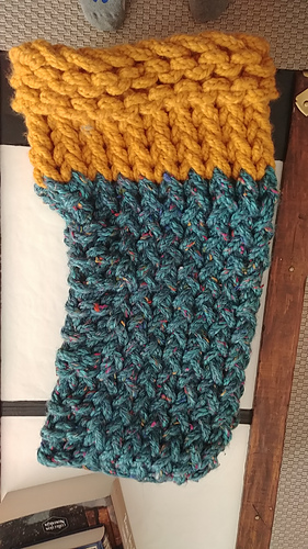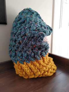 J’ai recommencé plusieurs fois, comme je me trompais dans les instructions et le vidéo. Le nombre de rang marchait pas, le trou pour le visage est trop petit, je voulais que le cowl soit large comme un capuchon. Puis, il me manque de la laine et pas de chance c’est en rupture de stock pratiquement partout… Je parle avec ma mère, on devra mettre une autre laine, j’essaie avec ce que j’ai à la maison, mais pas assez. Finalement, je cherche en ligne sur Micheals pour une couleur qui irait bien avec orange, rose ou gold. Ma mère choisi gold. Après que le mari de ma mère ait la laine en ramassage et viennent me l’a porté en même temps que d’autres choses. Je tresse la laine moutarde jusqu’à une certaine longueur pour le nombre de rang qui me manque au cowl et je recommence.