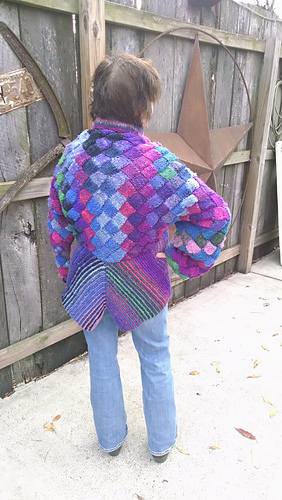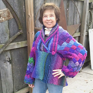 I was most fortunate to have the Noro Kureyon donated to me to keep me occupied and help me recover from major throat reconstruction surgery. I knit to the gauge and dimensions of pattern for the small size. Just a personal preference, next time I would make the bottoms longer. I didn’t because I didn’t get enough yarn to do so and frankly didn’t come to the realization until it was finished. Again, this is just my personal preference. I think the jacket looks fantastic! It is warm without being heavy and is a great conversation starter. I really enjoyed knitting this jacket and look forward to making others. I know each will be one of a kind. Noro is the best yarn to use for this project. I loved watching the colours come together. We all know about and love Noro and abrupt colour changes. As I hit one of those pesky knots I would take the knitting back to either the beginning of an entrelac square or triangle or to the beginning of a row. For the bottoms, I kept my yarn changes to the seam side of the piece. The opening of each sleeve (base row and top row of entrelac tube) varied quite a bit and so i did a row of single crochet around each, one sleeve in each stitch and every third stitch in the other sleeve to have them more uniform in size. Have fun knitting this jacket. You’ll really enjoy the knitting aspect as well as receiving all your compliments! Thank you, Irina, for a wonderful and most cleverly designed jacket.
