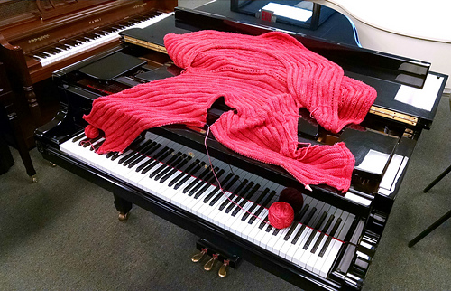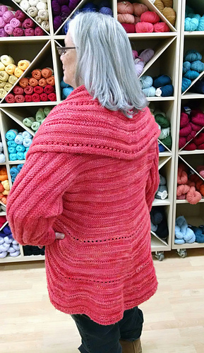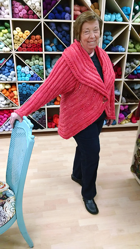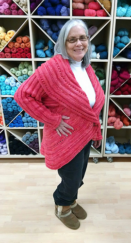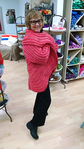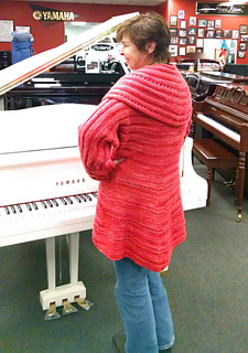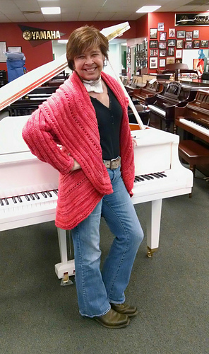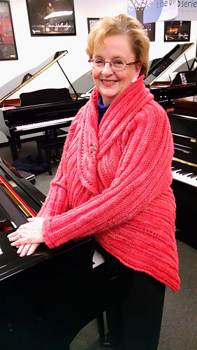 Jan. 13. Took the swirl jacket out to visit this afternoon. Stopped at Bliss Yarns in Brentwood, TN and ladies fell in love. They very generously agreed to try on the jacket and let me take their picture. As you can see, even size 1 suits a variety of women. This jacket was created for a fundraiser for head/neck cancer. Pam Tillis sponsored the purchase of the yarn. When pictures of the swirk was posted online people asked “what size it it?” I wanted to demonstrate the jacket size is versatile. I think a knit, Swirl trunk show may be coming to Nashville area. Hope so! Next I stopped at Miller Piano Specialists in Franklin. These folk have been active supporters of HBC awareness and were excited to see swirl ready for prime time. I am the brunette with the lary tube/button and big smile. :-)