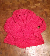 Jan 12. Knitting portion completed. 81 actual hours total, not including time to tink or frog and reknit or knit rose. Set up on blocking wires and steam blocked and let sit for an hour as I don’t have time for wet block. Blocking, seaming and weaving of ends took 4.75 hours. Not bad. I bought a spool of ribbon yesterday but it’s too wide. Will take back and exchange for narrow ribbon. I knit the rose but making it look good is challenging me. I still have time to futz with it. My yardage usage was significantly more than amount needed as printed in knit, swirl book. My gauge was accurate and I documented each welt to be sure jacket came out with expected dimensions.