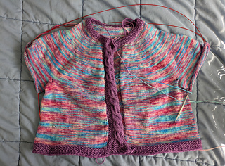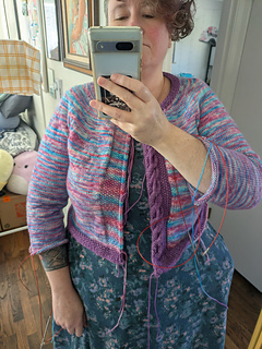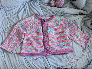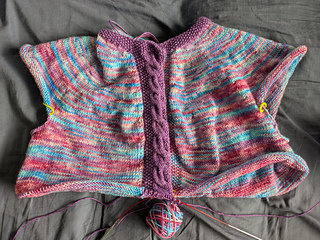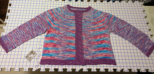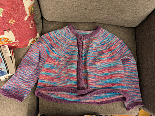 collar in purple, switch to unicorn for body, intarsia with purple cable side button band - I think this will work out to the right amounts of yarn in the colors I have. may need to adjust bottom hem and/or sleeves depending on yarn usage.