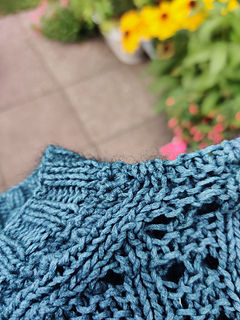 Weil er sehr lang ist, hängt er sich aus. Dadurch zieht das Muster etwas nach unten in die Länge. Der Halsausschnitt ja nachträglich enger gemacht und deshalb ist das Muster dort an den Kanten enger/fester zusammen und zu den Armausschnitten hin nach unten gebogen.