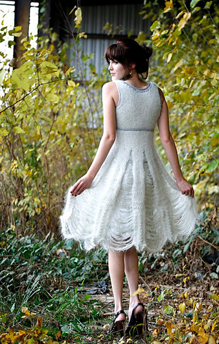 Most of the dress is knit in a cream colored mohair yarn with a silver thread running through it, the trim around the neck, armholes, and under bust was done in a silver silk. I used strategically placed dropped stitches to create the sections of floating yarn. My favorite thing about this dress is what happens when the wearer moves, especially twirls. The bottom of the skirt opens up and lifts into the air!