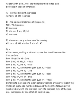 44-45* triangles (& into squares if carried further) like grandmother’s dishcloth. Experimenting with what shape occurs depending where increase is placed, and how many increases. Shawl shapes are also good examples.