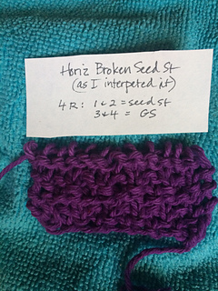 52 Horizontal broken seed st, my interpr. by looking at it (easiest if start with odd # sts)