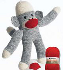 If you did want to knit some mini-socks yourself, or the complete monkey shown in the 2nd picture, you can use the Patons Classic Wool, light grey marl for the body of the sock (and just about anything for the cuff and heel). I found a pattern for that monkey at the Michaels website, and I think it’s the same pattern here on Ravelry.