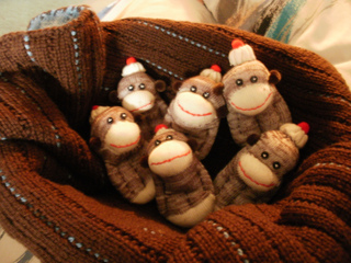 the kit for making 6 monkeys, including pattern - $12.99 - also shows some done in pastel socks - ditto - says “sold” 9-4-10