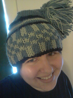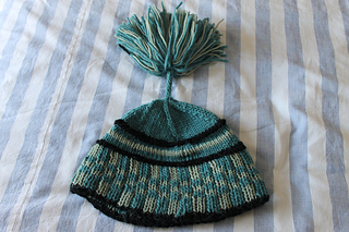 I started with 88 stitches, doubled for double knitting. The brim is done that way, reversible, so that there’s a double layer of knitting over the ears. I then took the black yarn and did an entire row of K2tog to unite front and back, followed by four rows of plain black stockinette, working the last one picking up the reverse side purl bump of the first row of black to create a welt. Then a couple of simple stripes in single thickness on 88 stitches to add more depth, and another 5-round stockinette stitch welt. Then about five rounds of solid teal. After that I began my decreases, dividing the stitches into 6 groups of 11, and working SSK-knit to next marker, followed by a round of plain knit, until I had only 6 stitches left. I finished of with three inches of I-cord on my remaining 6 stitches, and bound off, leaving a long tail.