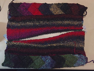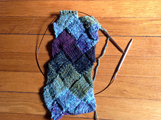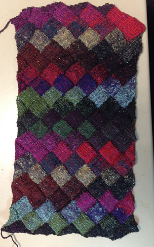 Center front body panel half done. It’s very clear that the recommended needle sizes with my yarn will not produce anything near the gauge desired. Be prepared to go down two or three needle sizes. I am now working the center front entrelac panel on a 4.0mm, and am still coming up with a 14-inch width instead of a 12.5-inch width. In my case this isn’t undesirable because I want to make a piece that’s bigger than the largest size as written. Your mileage may vary, however.