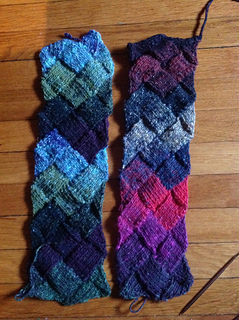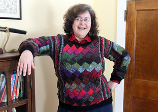 Finished front and back entrelac panels, sewed them together at the shoulders, picked up and knit out the side bands. Picking up was again quite easy. The pattern specifies 98 stitches up the front, and another 98 stitches down the back. I picked up 10 stitches per edge triangle and came up with counts of 100 each for front and back. Not a problem. Also, to add a bit of width, I worked my side panels about .75 inch wider than the pattern indicates. That gives me about 3” extra width on the body, total - which will be a perfect fit. Because the sleeves are drop-shoulder, and because being tall, the original measurement for cuff to collar was short for me anyway, it’s also not a problem.