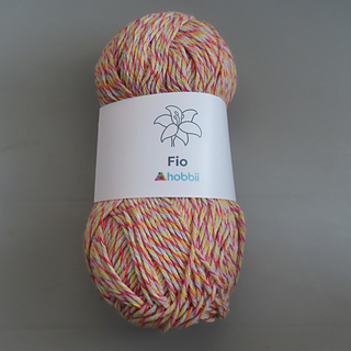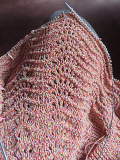 I really like this yarn. I’d say it’s sport weight or a heavy fingering weight. It’s comprised of 10 plies with 2 strands each of the following colors: peach, yellow, rose, lavender and pale blue. The overall effect is a coral melange. Since the yarn contains 30% polyester, I’m guessing that it will shrink less in the dryer (mostly lengthwise) than 100% cotton yarn. But do allow for some shrinkage if you do plan to launder garments this way.