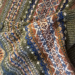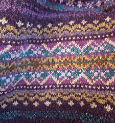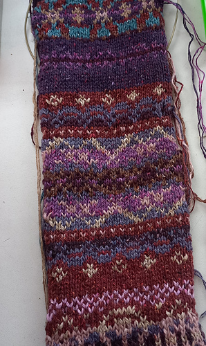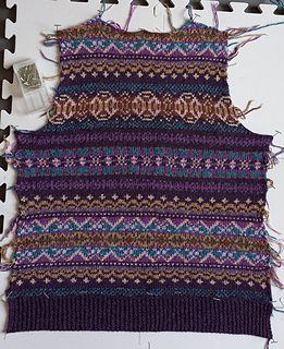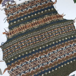 Постирала спину, булгаро конечно прекрасен для жаккардов, примеси вроде бы отчасти убрали его колкость, м.б. надо было все-таки сразу кардик вязать?.. Хотя нет, уже решила на переде сменить раскладку цветов, поэтому кардик пока на потом.