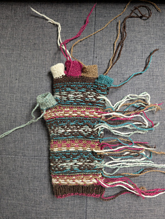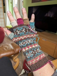 I started the thumb gusset in a dark brown round after a teal round. It ended in a teal round, where the stitches were put on waste yarn (so basically almost a whole pattern height).