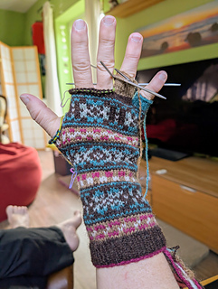 Now 22 sts for back of hand, 20 sts for inside of hand (palm) - the middle is not quite above the center of the thumb gusset, it’s 4 sts to the right!