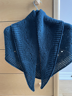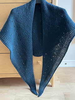 Wore it for the first time immediately after it finished blocking. It dries quickly given gauge and weight. (I do love a cozy, sizeable shawl that weighs under 180g!) It’s very easy to wear. I have a feeling it will be used in regular rotation. The size is terrific. Would not want it any bigger. It’s still deeper than necessary for me (and mine is 4” less deep than pattern dimensions) but less bulky than a standard triangle.
