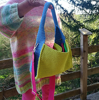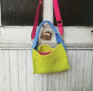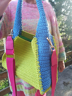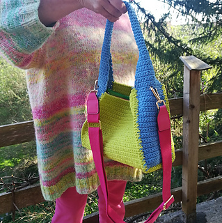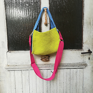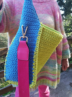 - seite: fM in 15 hin- u. rückreihen (1. reihe: 16 fM in den hinteren bogen der lfm-kette arbeiten), in 16. hinreihe: aussparungen für den karabiner des tragegurtes arbeiten: 6 fM, 1lfm über 7.M, 2fM, 1lfm über 10.M, 6 fM, wende-lfm, rückreihe fM. - über die nächsten 7 hin- u. rückreihen beidseitig 3x je 2M zus. abhäkeln bis nur noch 10M übrig sind - weiter in rd bis henkel lange genug, dann 2. seite gegenleich arbeiten