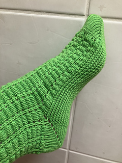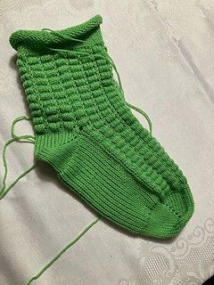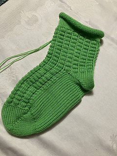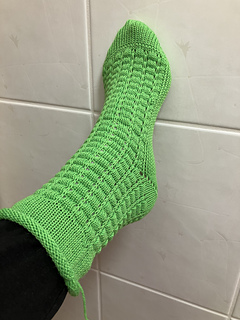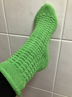 Knitted this sock toe-up. It just fits my size 5½, but I will unravel it. It looks quite nice, but the foot is much too thick for my taste. I would prefer to knit the foot in stocking stitch only and work the leg in pattern. I would then finish it with a seam, either in the mock ribbing suggested by the instructions or even in stocking stitch.