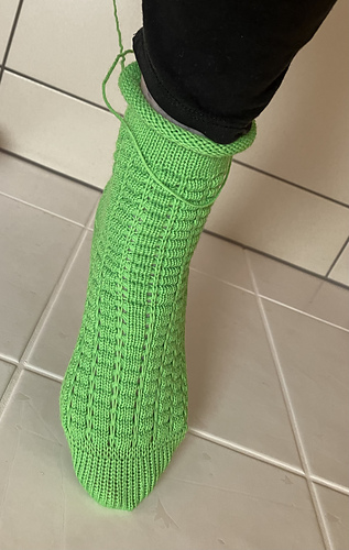 Während das Muster für die Fußsohle perfekt ist, gibt es am Spann einige Unregelmäßigkeiten, da ich mich bei der Reihenzahl verzählt habe.