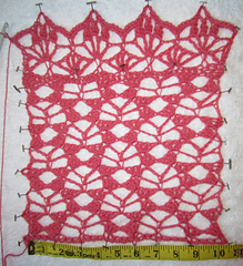 FINGERING Guesstimate #2: Swatch with lace border pins out to 10” x 11.5” = 115 square inches. This took 65 yd. of yarn (measured by hand, not weight). This works out to .57 yd. of yarn per square inch, very close to the last swatch.
