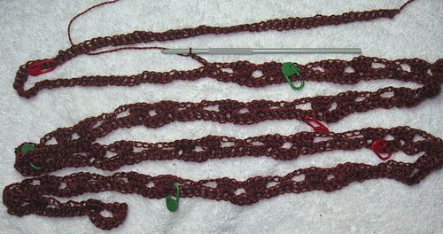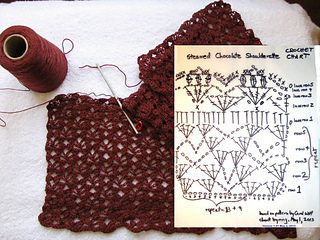 The designer says it could be made in a heavier weight than fingering, and “If it seems too long, the pattern to begin is a multiple of 13 plus 9, so just reduce your number of chains accordingly. You could also work few rows.”