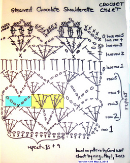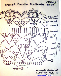 (NOTE: with my tension, a 5.0 mm. hook and this heavy fingering, I estimate that making this shawl as written would be 92” long.)
