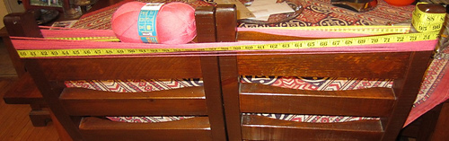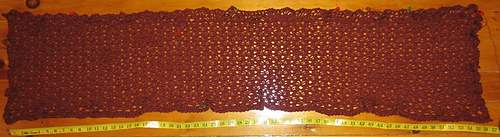 May 5 - on row 33 at about 12” deep and 62” long unstretched. Used 122 gm. of yarn so far, or about 755 yd.