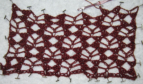 (NOTE: with my tension, a 5.0 mm. hook and this heavy lace weight, I estimate that making this shawl as written would be 63” long after blocking.)