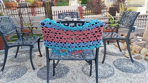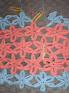 Almost finished second colour of denim blue. You can see with my paper clips where I twisted and joined the first section to itself. The green paper clip is in the middle of the that section.