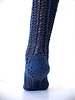 Final Note with pictures: So the idea after I picked the yarn is that I really wanted to make a pair of fishnets. I wanted them to be fun and sassy, but not so sleazy that I looked like I was trying to pick up johns at the supermarket. Something I probably could have gotten away with in high school without being sent home. I also really love the straight seam up the back of stockings, but really was not interested in sewing up a seam to get it. I wanted minimal coverage for the heel and toes (I hate it when the stick out of the holes) but I didn’t want it to interrupt the line of the sock too much and the bottom of the foot had to be open. Since my legs are pretty thick (That’s not my leg in the pictures, that’s my mom) I thought a strong vertical emphasis would be the most flattering so I opted for lace that is rather structured.