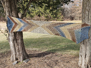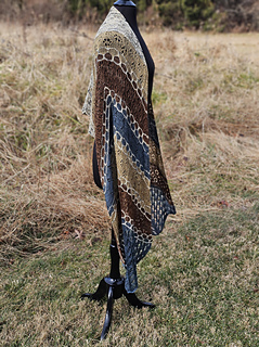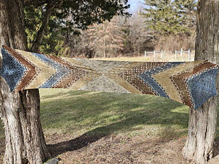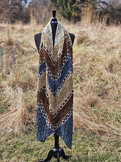 For my personal reference, gauge needle is US4, larger needle used in the transition sections is US5, smaller needle used in the final section is US3.