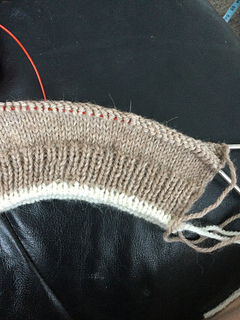Change to 4mm needles and the taupe yarn and knit 10 rounds of k1p1 rib