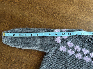 When you have finished the decreases and the remaining sts are 22 st for front and back and 10 sts for each sleeves (22+10+22+10= 64), knit one more round but stop half way across the back and begin the German Short Rows.