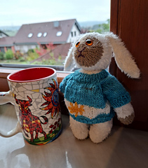 Pulli zum Tango Argentino: in den Farben der Landesflagge. Ein bisschen zu weit ist er geworden und die Farbverteilung ist nicht ganz geglückt. Aber das Hellblau ist schön. Als RVO gestrickt.