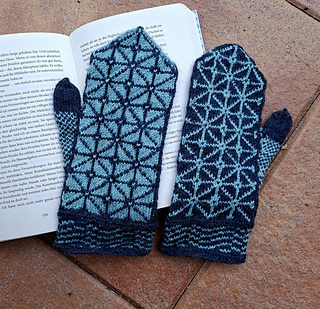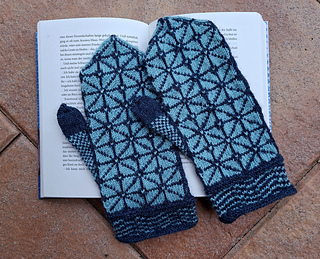 Ein wenig habe ich sie abgeändert, vor allem habe ich Daumenzwickel gestrickt. Außerdem sieht das Design exakt inverse Handschuhe vor. Da ich aber Zweifel hatte, ob die hellblaue Wolle dafür ausreicht, habe ich die beiden Handschuhe exakt gleich gestrickt. Die “Manschetten” sind also nicht invers, nur die Handteile.