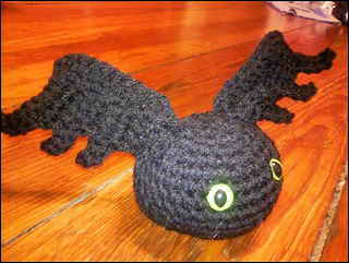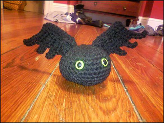 To make this adorably absurd bat, I used her Tiny Crochet Ball pattern for the body. The wings are from a super cute baby Cthulu pattern. Finally, the ears are made of the large spikes from Fierce Little Dragon. I suppose you could use the small spikes instead, but the big ones seemed better suited. All the patterns I used are free. In addition to the yarn, you’ll need some buttons or safety eyes and a needle for sewing them on.