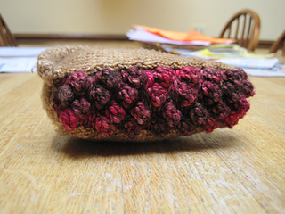 Sept 15: Started seaming pieces but cherry filling isn’t quite deep enough. Need to backtrack and either add another bobble row or decrease height of back of pie (outer edge) by 2 rows.