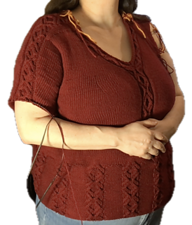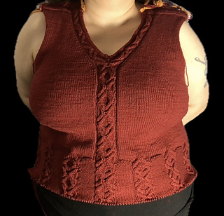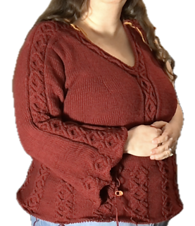 Also, as I knit this in a light worsted, I put half the cable pattern on each side of the neck. I think these changes will make the sweater look better when it’s not skin tight on a thin woman.