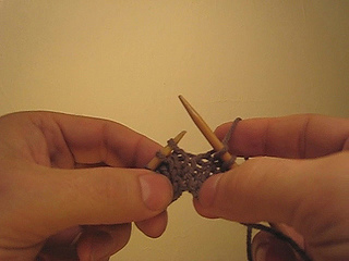 Row 2: Knit 2, pull loop through 2 stitches as follows: Knit 1, slip one as if to knit, transfer 2 stitches back to left needle, then pull the second stitch over the first. Drop the yarn and enlarge the stitch that remains on the left needle to form a large loop. Using the "tight" end of the loop yarn, knit 2.